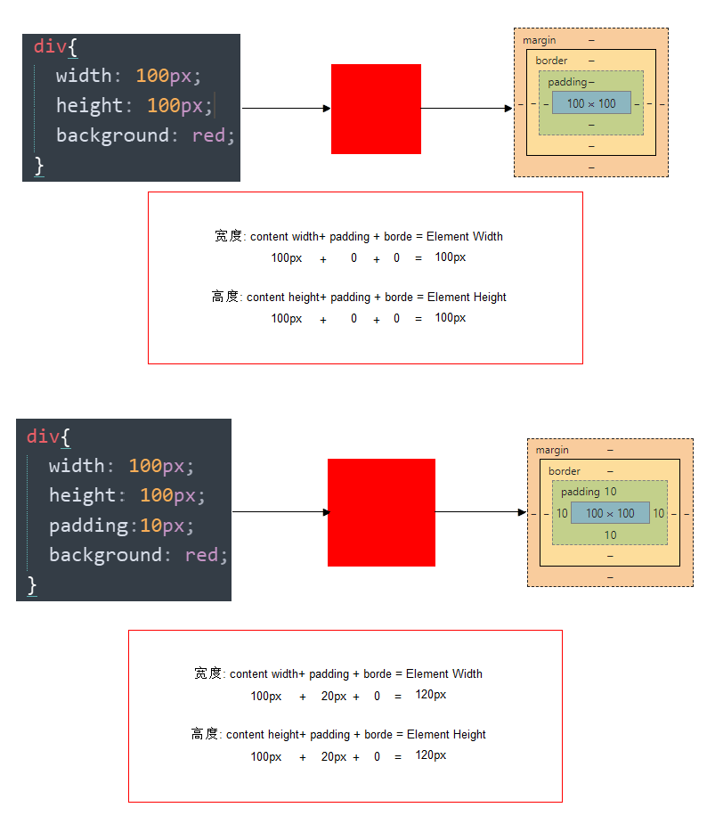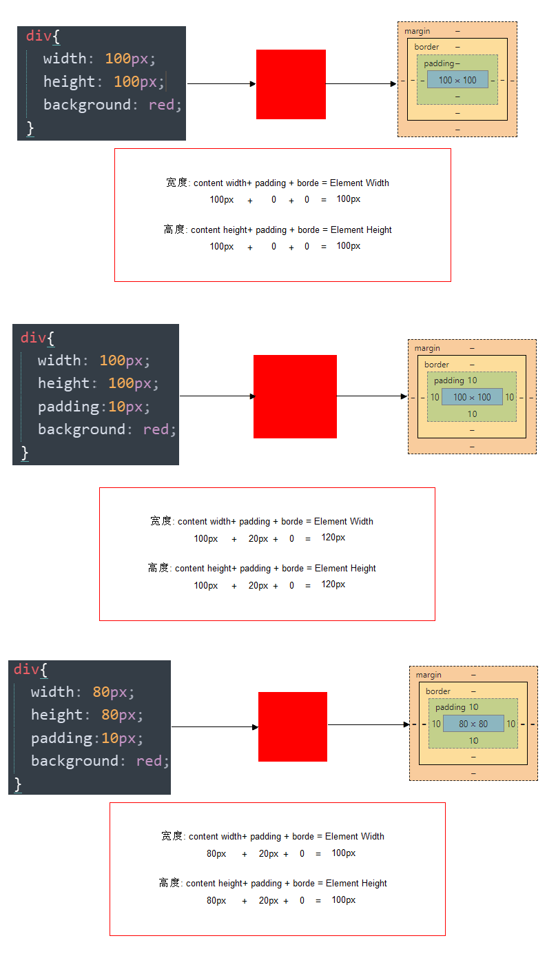 盒子的实际的大小 = 内容的宽度和高度 + 内边距 + 边框