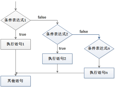 xxxxxxxxxx// 适合于检查多重条件。if (条件表达式1) { 语句1;} else if (条件表达式2) { 语句2;} else if (条件表达式3) { 语句3; .} else { // 上述条件都不成立执行此处代码}执行逻辑