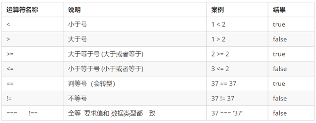 概念:比较运算符(关系运算符)是两个数据进行比较时所使用的运算符,比较运算后,会返回一个布尔值(true / false)作为比较运算的结果。