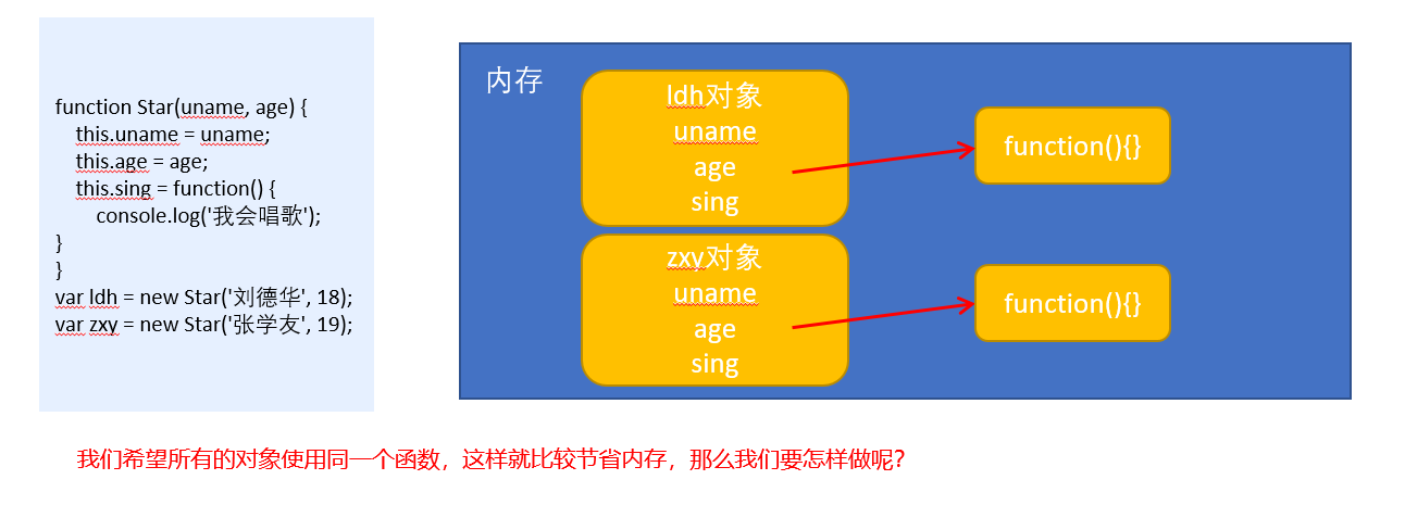 xxxxxxxxxxfunction Star(uname, age) { this.uname = uname; this.age = age;}Star.prototype.sing = function() { console.log('我会唱歌');}var ldh = new Star('刘德华', 18);var zxy = new Star('张学友', 19);ldh.sing();//我会唱歌zxy.sing();//我会唱歌