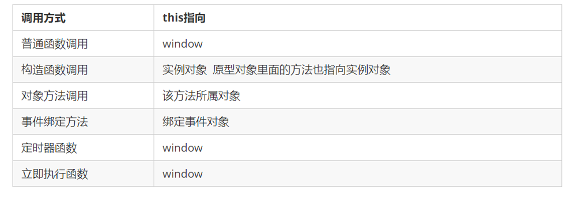 xvar f = new Function('a', 'b', 'console.log(a + b)');f(1, 2);var fn = new Function('参数1','参数2', '函数体')注意/*Function 里面参数都必须是字符串格式第三种方式执行效率低,也不方便书写,因此较少使用所有函数都是 Function 的实例(对象) 函数也属于对象*/xxxxxxxxxx/* 1. 普通函数 */function fn() { console.log('人生的巅峰');} fn(); /* 2. 对象的方法 */var o = { sayHi: function() { console.log('人生的巅峰'); }}o.sayHi();/* 3. 构造函数*/function Star() {};new Star();/* 4. 绑定事件函数*/ btn.onclick = function() {}; // 点击了按钮就可以调用这个函数/* 5. 定时器函数*/setInterval(function() {}, 1000); 这个函数是定时器自动1秒钟调用一次/* 6. 立即执行函数(自调用函数)*/(function() { console.log('人生的巅峰');})();这些 this 的指向,是当我们调用函数的时候确定的。调用方式的不同决定了this 的指向不同