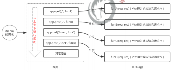 路由就是映射关系。请求方式和资源路径与处理函数中间的对应关系。所以路由分 3 部分组成,分别是请求的类型、请求的 URL 地址、和处理函数。