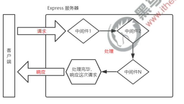 中间件(Middleware ),特指业务流程的中间处理环节。当一个请求到达 Express 的服务器之后,可以连续调用多个中间件,从而对这次请求进行预处理。