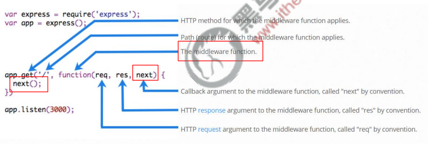 注意:中间件函数的形参列表中,必须包含 next 参数。而路由处理函数中只包含 req 和 res。