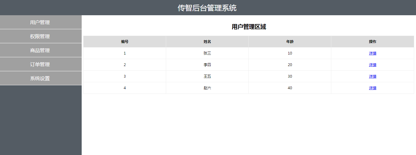 xxxxxxxxxx const Users = { data(){ return { userList:[ {id:1,name:"zs",age:18}, {id:2,name:"ls",age:19}, {id:3,name:"wang",age:20}, {id:4,name:"jack",age:21}, ] } }, template:`<div> <h3>用户管理</h3> <table> <thead> <tr> <th>编号</th> <th>姓名</th> <th>年龄</th> <th>操作</th> </tr> </thead> <tbody> <tr :key="item.id" v-for="item in userList"> <td>{{item.id}}</td> <td>{{item.name}}</td> <td>{{item.age}}</td> <td><a href="javascript:;">详情</a></td> </tr> </tbody> </table> </div>`}8.当用户列表展示完毕之后,我们可以点击列表中的详情来显示用户详情信息,首先我们需要创建一个组件,用来展示详情信息