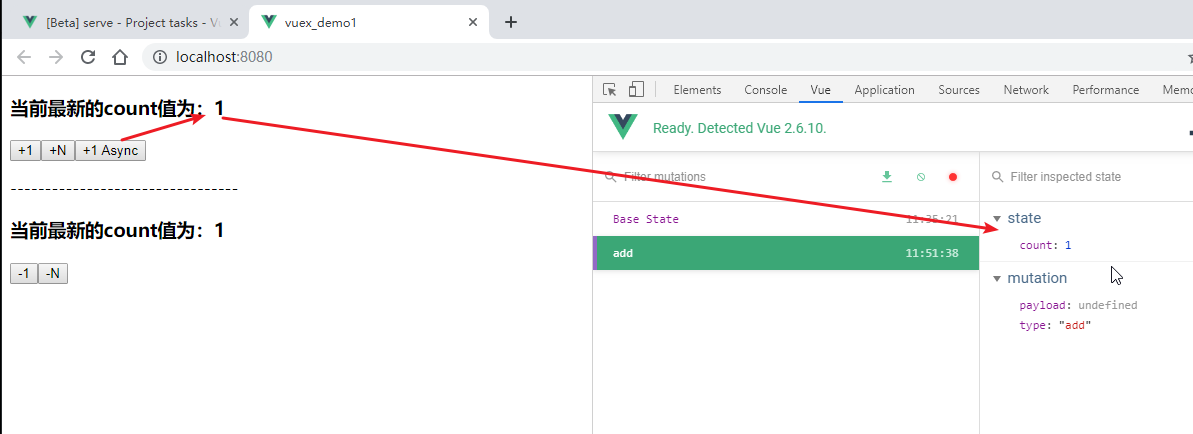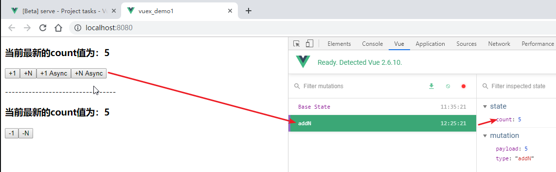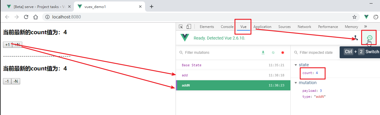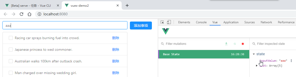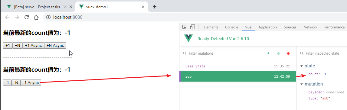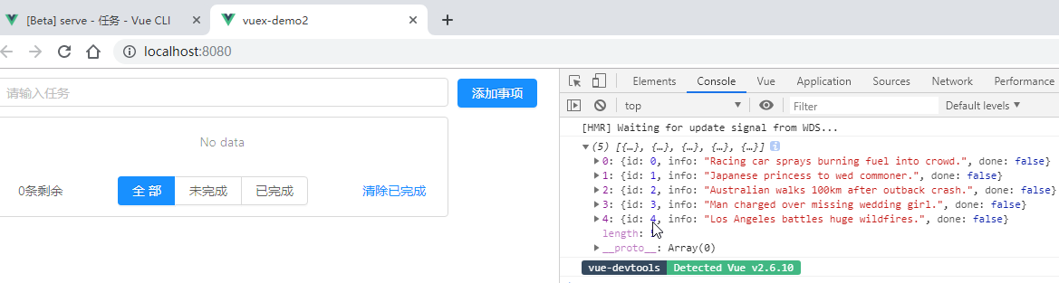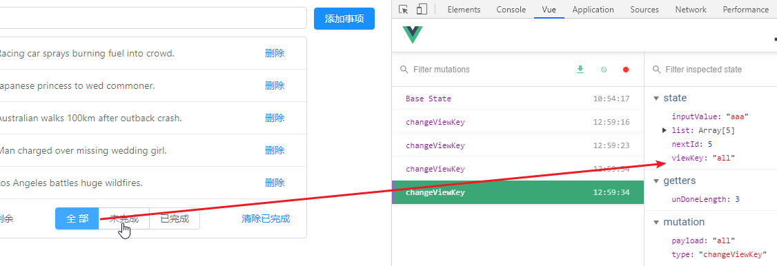 先来看一个现象:通过vue调试工具中的第二个窗口,vuex数据窗口