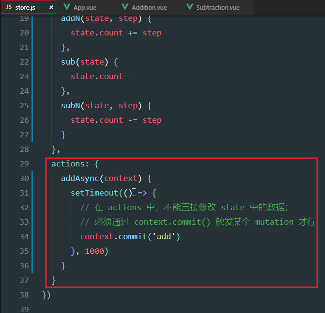 actions中不能直接修改store的数据,数据只能在mutations中修改