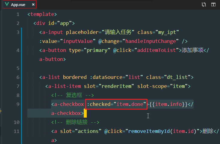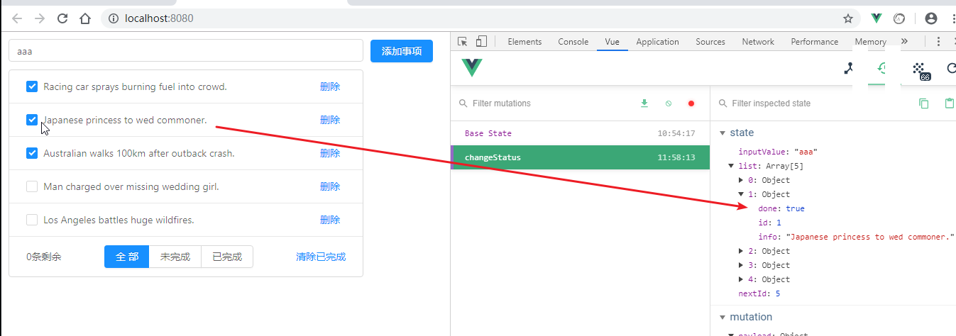 复选框选中状态,跟数据中的done完成数据是相关的,我们现在改变俩值