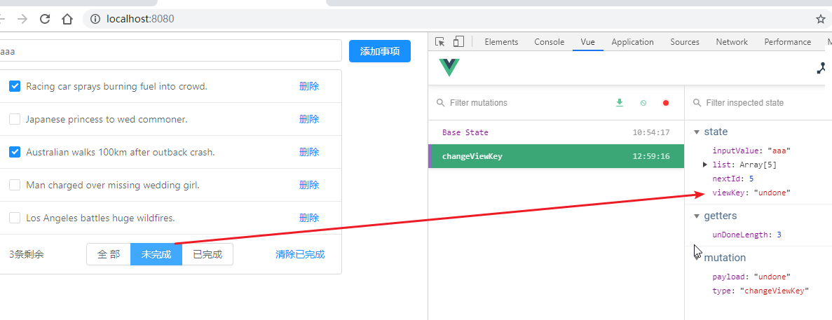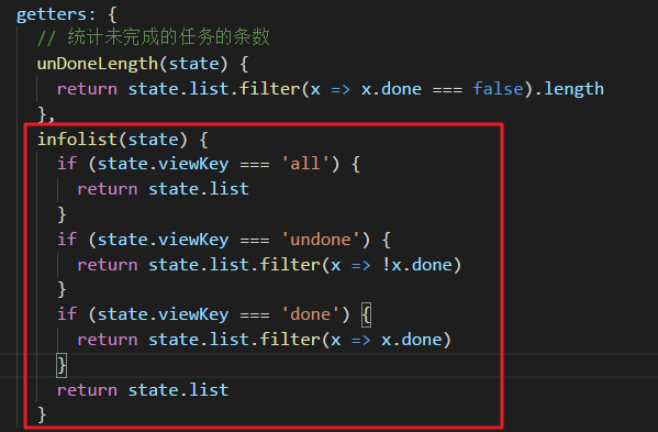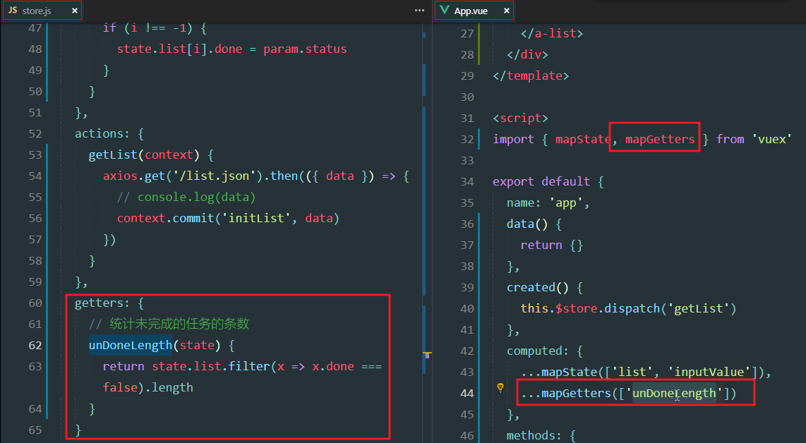 store.js中增加getters方法,unDoneLength,统计未完成数量
