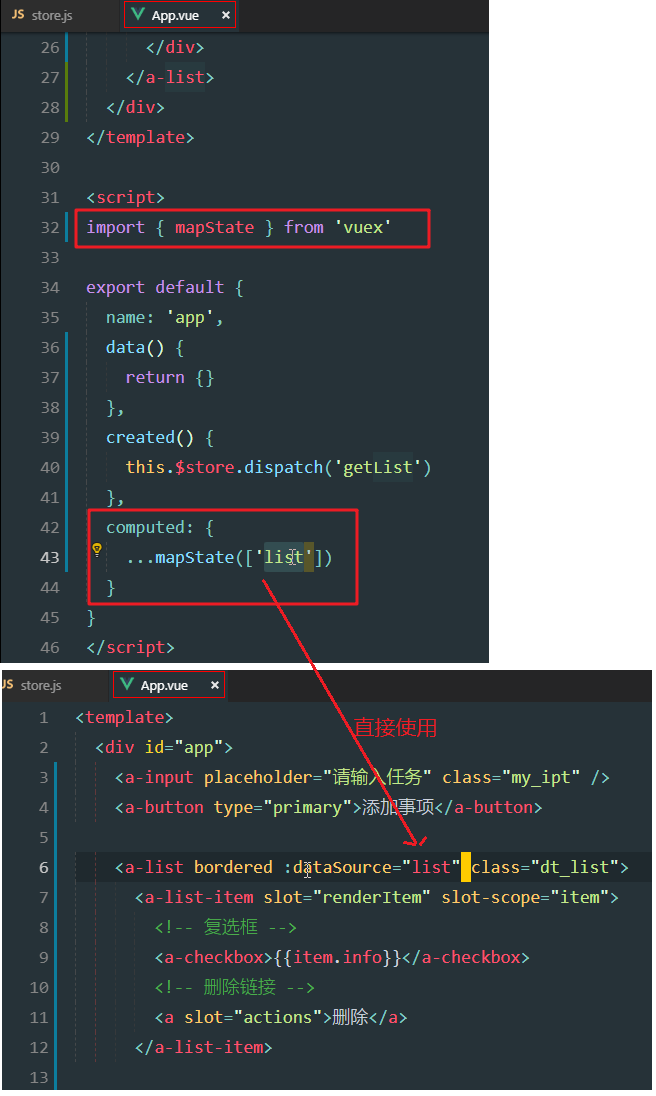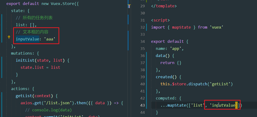 store.js中定义inputValue数据,App.vue中映射inputValue