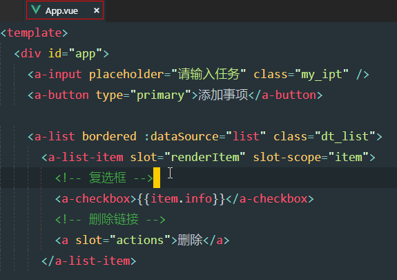 xxxxxxxxxx<template> <div id="app"> <a-input placeholder="请输入任务" class="my_ipt" /> <a-button type="primary">添加事项</a-button> <a-list bordered :dataSource="list" class="dt_list"> <a-list-item slot="renderItem" slot-scope="item"> <!-- 复选框 --> <a-checkbox>{{item.info}}</a-checkbox> <!-- 删除链接 --> <a slot="actions">删除</a> </a-list-item> <!-- footer区域 --> <div slot="footer" class="footer"> <!-- 未完成的任务个数 --> <span>0条剩余</span> <!-- 操作按钮 --> <a-button-group> <a-button type="primary">全部</a-button> <a-button>未完成</a-button> <a-button>已完成</a-button> </a-button-group> <!-- 把已经完成的任务清空 --> <a>清除已完成</a> </div> </a-list> </div></template><script>export default { name: 'app', data() { return { list: [ { id: 0, info: 'Racing car sprays burning fuel into crowd.', done: false }, { id: 1, info: 'Japanese princess to wed commoner.', done: false }, { id: 2, info: 'Australian walks 100km after outback crash.', done: false }, { id: 3, info: 'Man charged over missing wedding girl.', done: false }, { id: 4, info: 'Los Angeles battles huge wildfires.', done: false } ] } }}</script><style scoped>#app { padding: 10px;}.my_ipt { width: 500px; margin-right: 10px;}.dt_list { width: 500px; margin-top: 10px;}.footer { display: flex; justify-content: space-between; align-items: center;}</style>