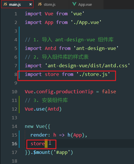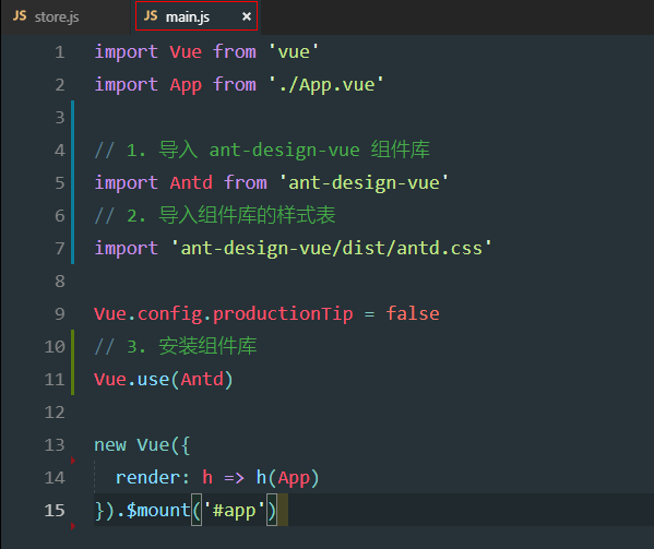 ximport Vue from 'vue'import App from './App.vue'// 1. 导入 ant-design-vue 组件库import Antd from 'ant-design-vue'// 2. 导入组件库的样式表import 'ant-design-vue/dist/antd.css'Vue.config.productionTip = false// 3. 安装组件库Vue.use(Antd)new Vue({ render: h => h(App)}).$mount('#app')替换main.js中所有代码