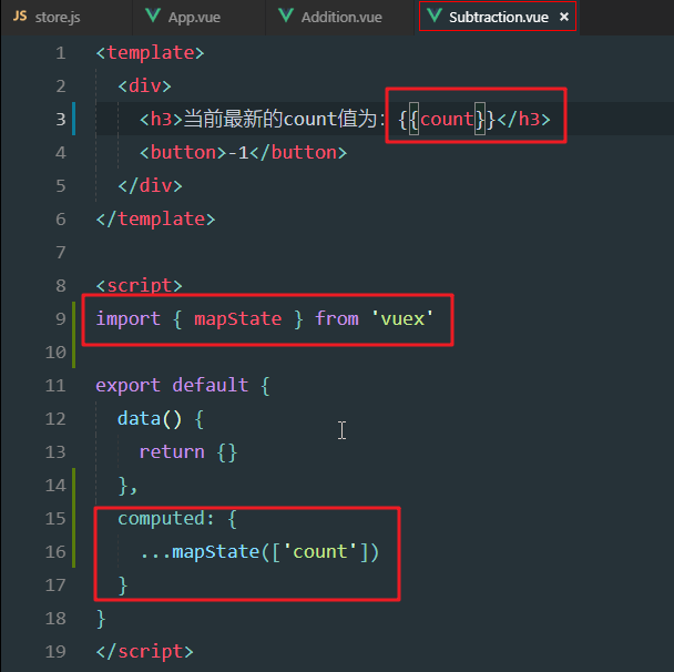导入mapState之后,就可以使用第二种用法:可以将store共享数据,映射为计算属性